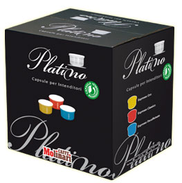 Η σειρά Platino είναι η καινούργια σειρά από κάψουλες του Caffe Molinari, που παράγεται με συστήματα υψηλής τεχνολογίας και σφραγίζεται ατομικά σε τροποποιημένη ατμόσφαιρα, έτσι ώστε όλα τα αρώματα του καφέ να παραμένουν αναλοίωτα και φρέσκα και απόλυτα προστατευμένα από τις καταστροφικές συνέπειες του αέρα και της υγρασίας μέχρι να φτάσουν στο φλιτζάνι σας. Αυτή η καινούργια σειρά του Caffe Molinari προσφέρει μια επιλογή από τα καλύτερα χαρμάνια καφέ και μια ολοκληρωμένη σειρά προιόντων για τους πιο απαιτητικούς καταναλωτές και γνώστες του καφέ.